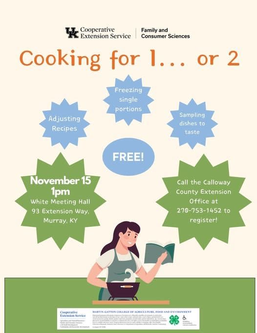 Join Calloway County Family and Consumer Sciences Extension for their “Cooking for 1 or 2” class, where you will learn delicious, budget-friendly recipes perfect for smaller households! Whether you are cooking solo or for two, this class will offer tips on meal planning, portioning and creating flavorful dishes without the leftovers.