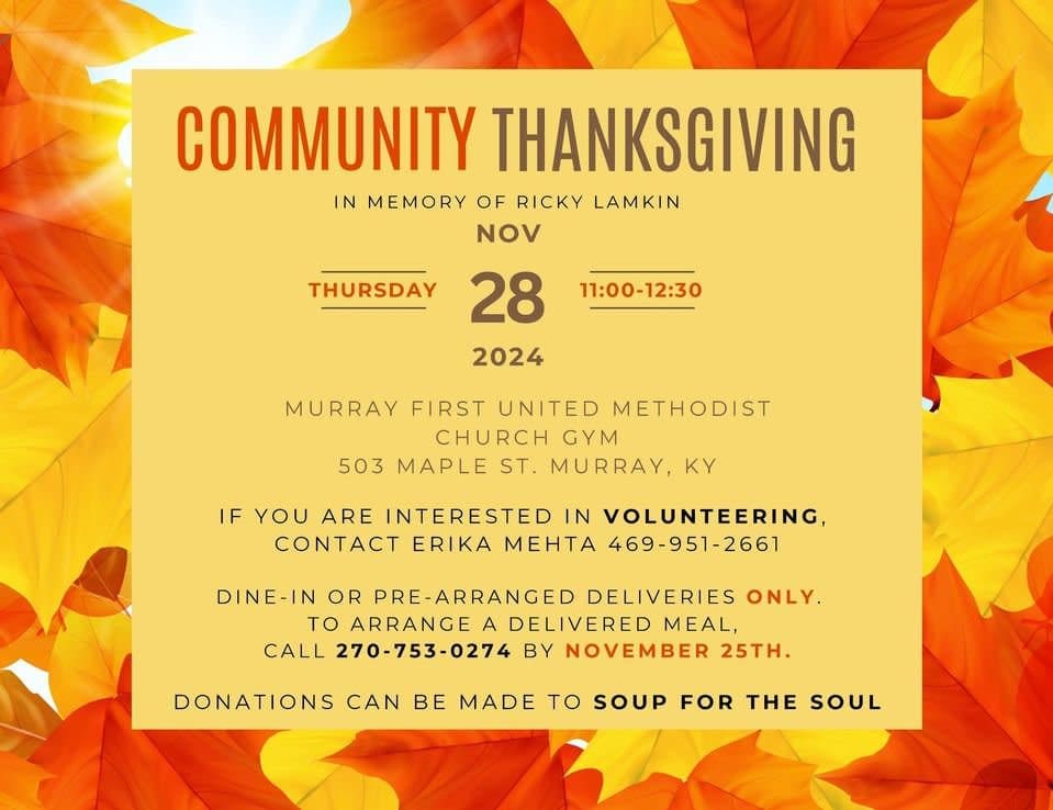 All are welcome to come and enjoy a free, delicious Thanksgiving meal, provided by the community of Calloway County. 11:00am-12:30pm at the gym of 1st United Methodist Church in Murray.