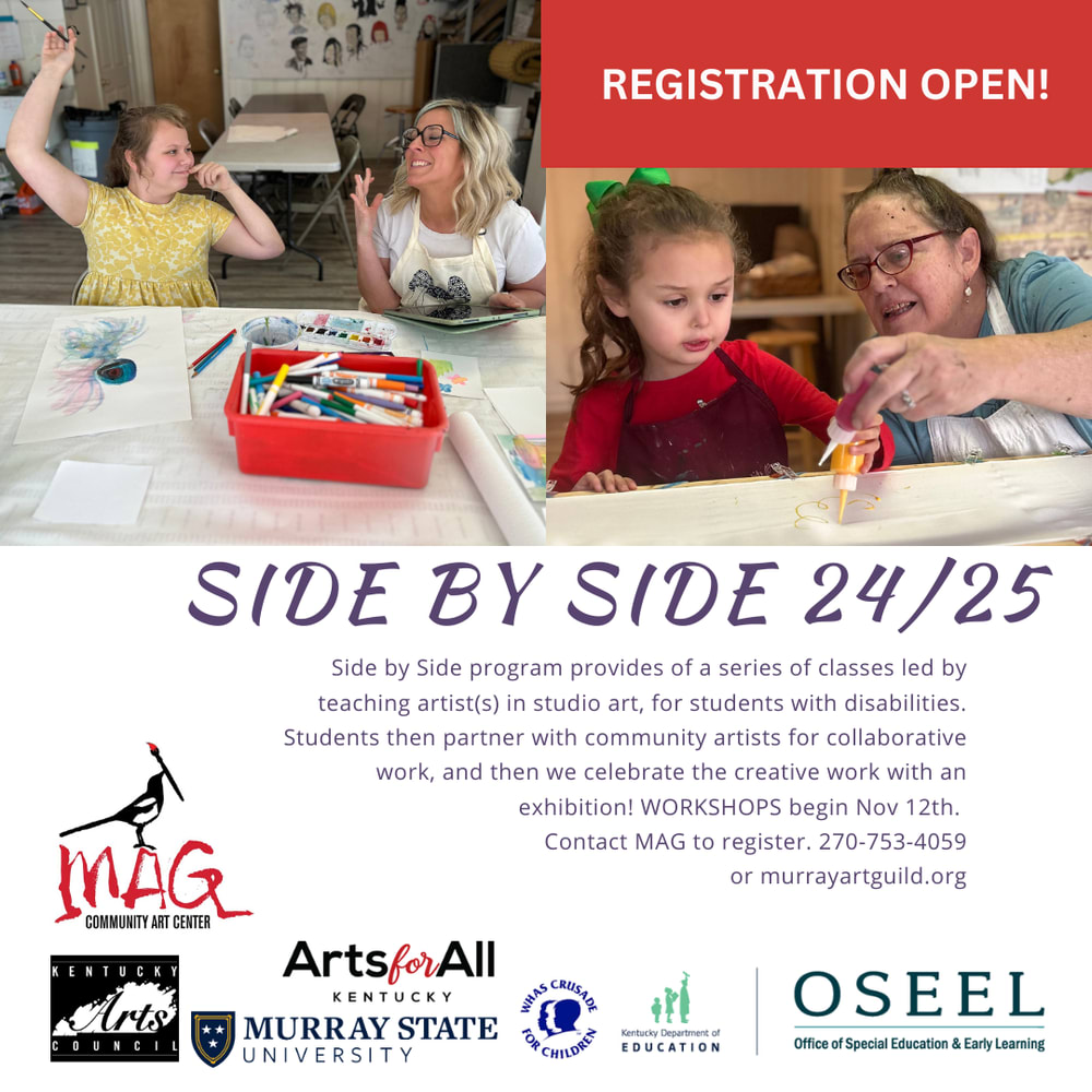 Arts for All Kentucky and the Murray Art Guild are pleased to announce that we are now accepting registration for your child to participate in the SIDE BY SIDE program. This fall, Arts for All Kentucky and the Murray Art Guild will be offering Side By Side. SIDE BY SIDE is designed to make available creative opportunities to students, reinforce inclusiveness and positive self-image, and highlight the importance of visual arts education to the development of our young people with disabilities.