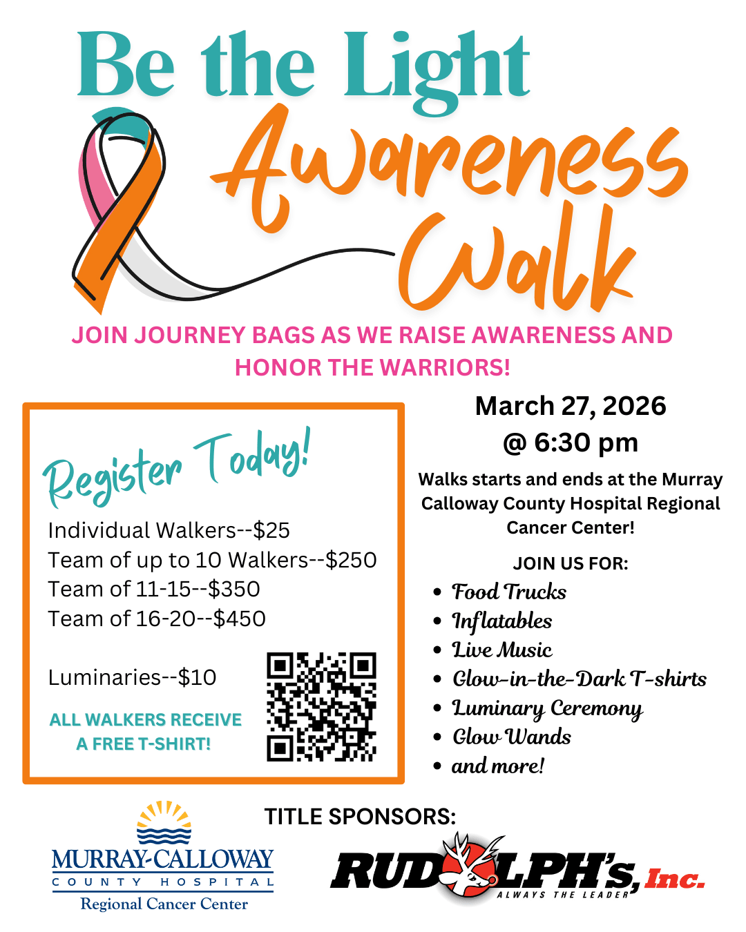 Be the Light is a Cancer Awareness Walk and fundraiser for Journey Bags. There will be live music, food trucks, inflatables for kids, photo booth, luminaries, cancer center tours, and a glow walk. Event Title Sponsors are Rudolph, Inc. and Murray Calloway County Hospital Regional Cancer Center.