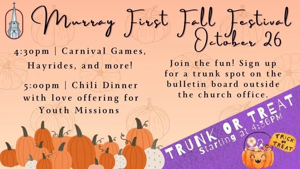 Join us on Sunday, October 26, for an evening filled with laughter, fellowship, and fun for all ages. We’ll kick things off at 4:30 PM with Trunk or Treat, hayrides, carnival games, and plenty of other fall favorites. It’s a wonderful way to gather as a church family and welcome our community for some good, old-fashioned autumn fun!