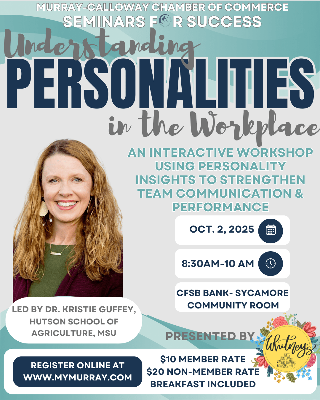 Join the Murray-Calloway County Chamber of Commerce for our next Small Business Seminar, “Understanding Personalities in the Workplace.” Discover how personality insights can improve communication, boost productivity, and build stronger teams. Led by Dr. Kristie Guffey, this engaging, hands-on session will help you better understand yourself, your coworkers—and yes, maybe even your boss!