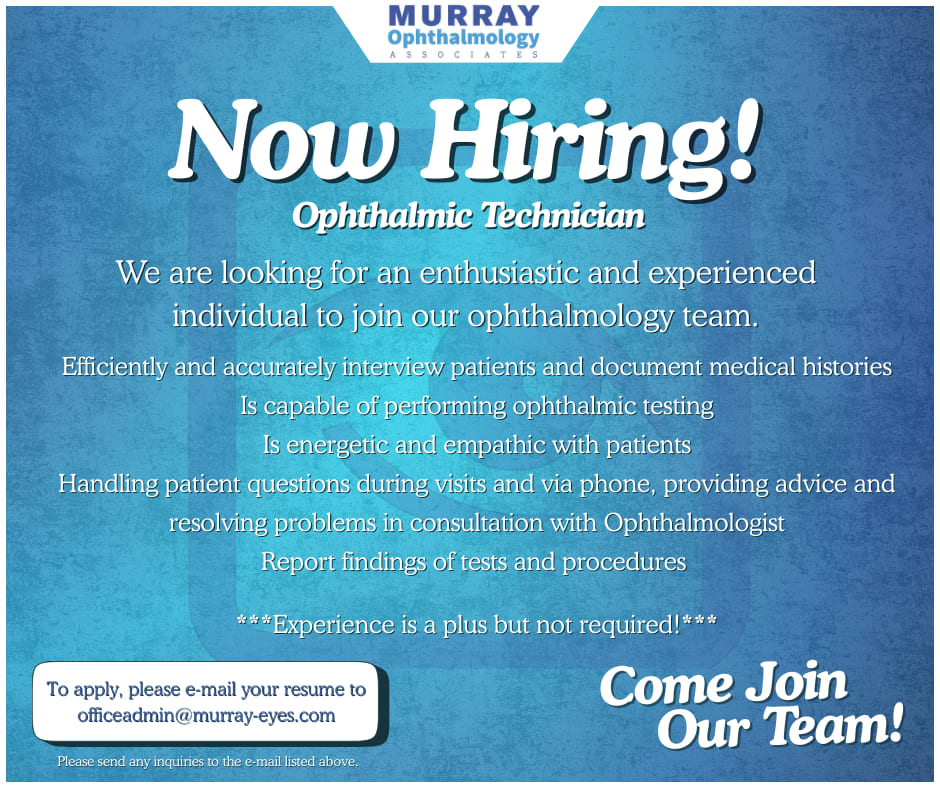 Where to Apply : Please send your resume to officeadmin@murray-eyes.com